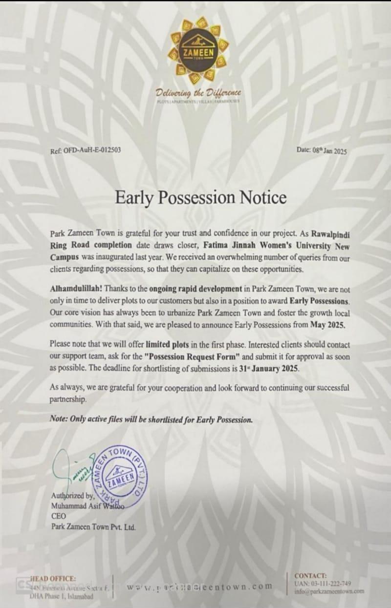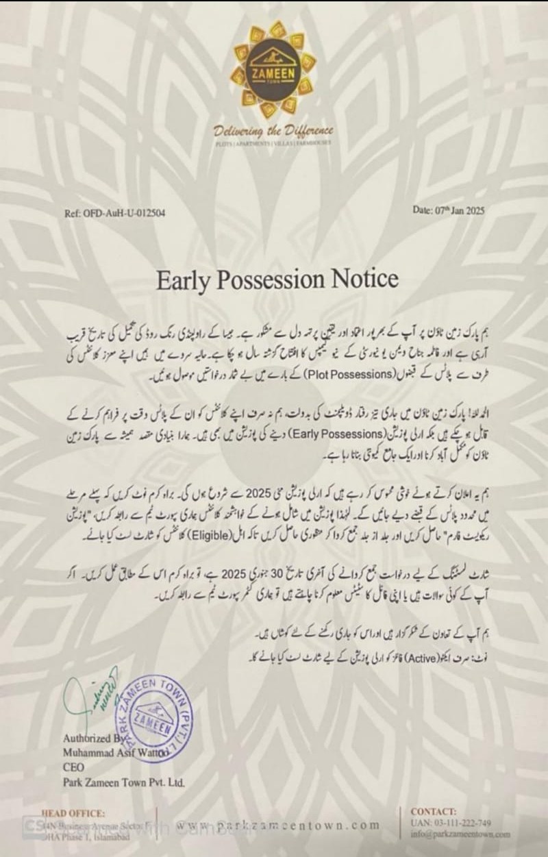 Initially, our goal was to develop Park Zameen Town, urbanize it, and make it an active residential community. The Early Possessions handover will start in May 2025. Management will announce the exact dates later.